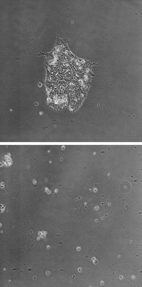 The top image shows a control colony of human embryonic stem cells at 48 hours. The bottom image shows, also at 48 hours, a colony of human embryonic stem cells treated to sidestream smoke from a harm reduction brand. Note that the colony has been killed by the smoke treatment. (Credit: Talbot lab, UC Riverside)