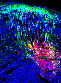 Image showing normal and abnormal neuron migrations – This image shows a section of cortex, with neuron nuclei labeled blue. Some normal neurons are tracked in green (they appear cyan in the image because they are labeled both blue and green). Many of them have reached the top of the cortex. Some abnormal neurons, in which the Reelin/N-cadherin pathway is blocked, are tracked in red (they appear yellow where they are superimposed on green, normal neurons). The abnormal neurons are blocked in the intermediate zone. Image provided by Yves Jossin.