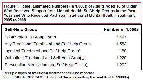 **Substance Abuse and Mental Health Services Administration, Office of Applied Studies. (October 8, 2009). The NSDUH Report: Mental Health Support and Self-Help Groups. Rockville, MD.