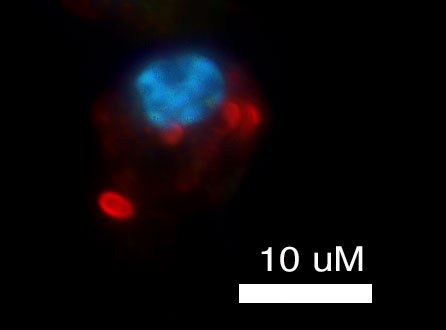 Bacteria (Streptococcus pneumoniae, red) under attack by a neutrophil (blue). Credit: Jeffrey Weiser, PhD, University of Pennsylvania School of Medicine